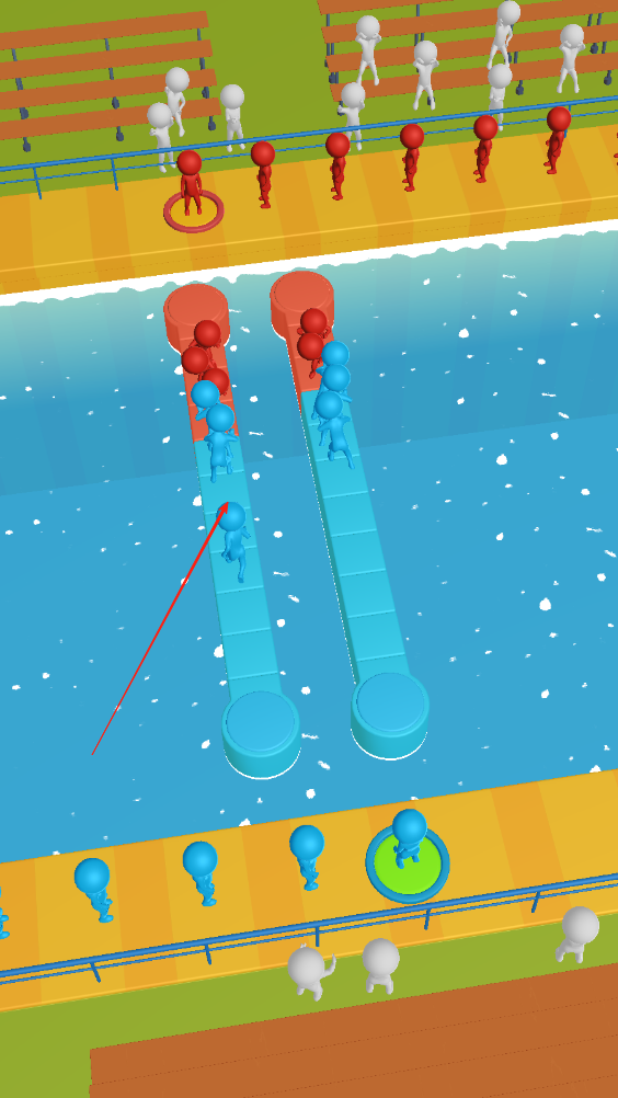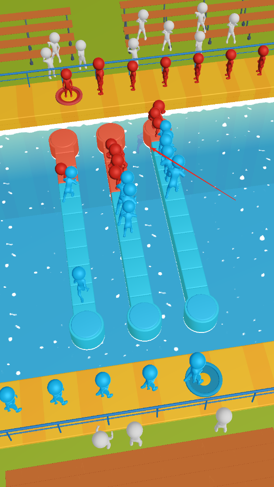 3、可以在别的赛道上放些队员,分散对手的注意力,在趁机继续在原本赛道上放置队员,将对面推入水中即可获胜。