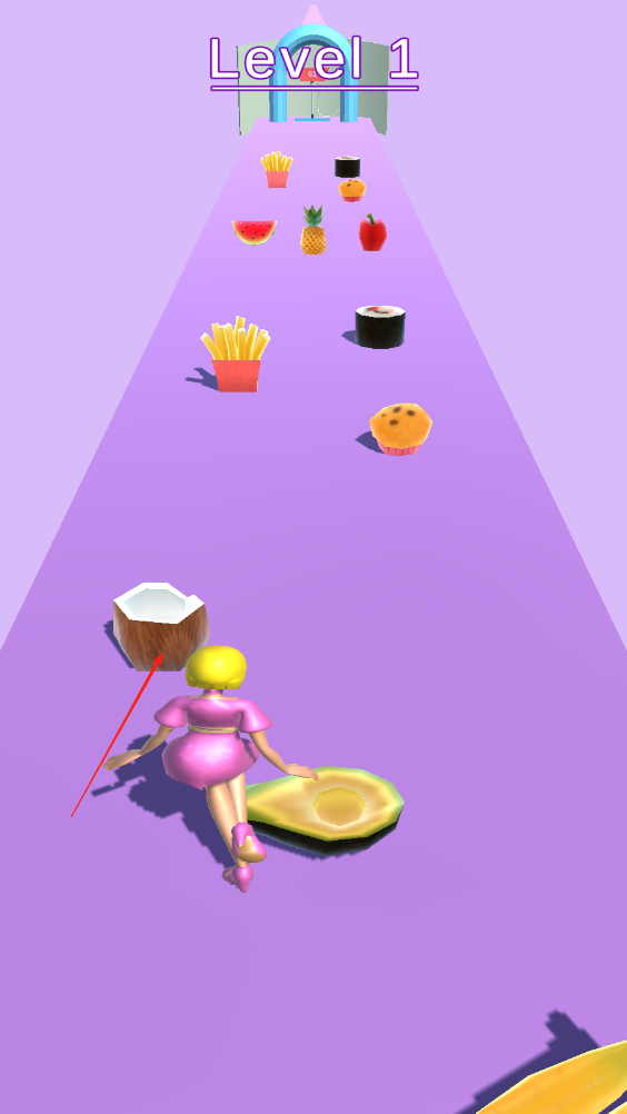1、前方出现各类食物,水果汉堡薯条等,控制角色吃掉食物,同时留意角色的身材变化,避免体重增长过快。