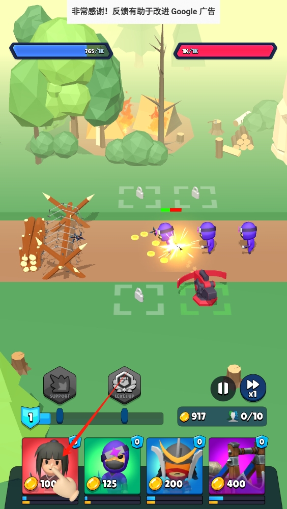 3、在战斗界面,召唤不同角色参与战斗,优先升级强力角色,击败敌人获取金币。