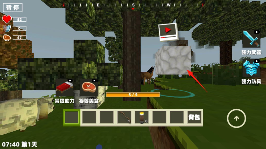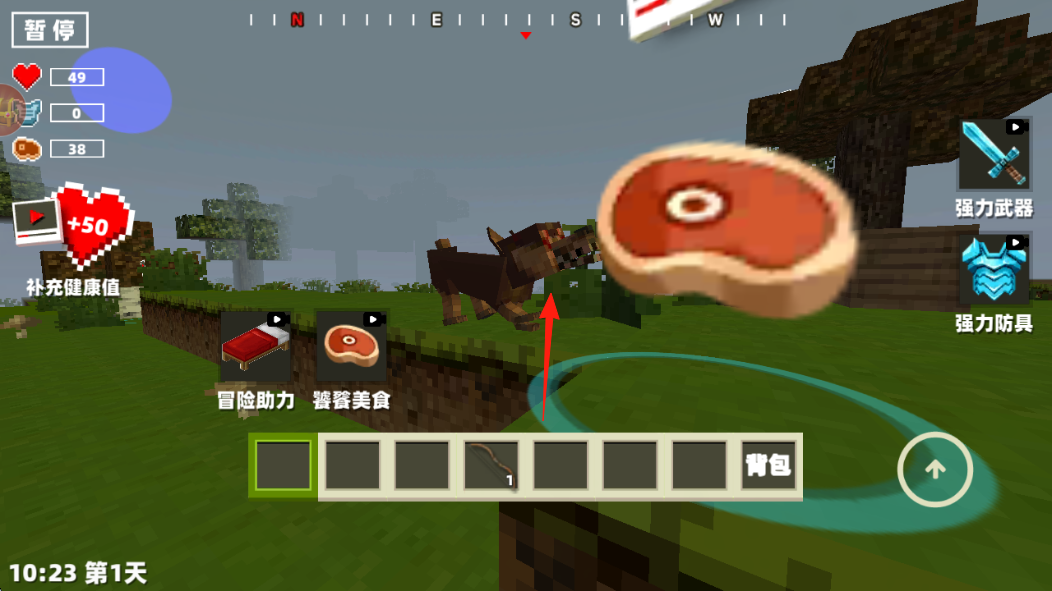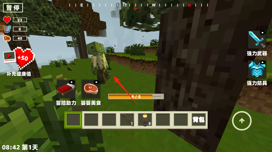 2、遇僵尸、野狼等怪物,用弓箭快捷栏攻击,注意血量心形、饱食度牛排,残血点补充健康值恢复。