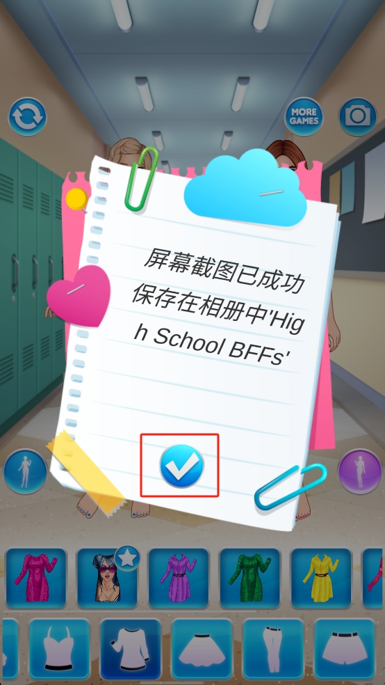 3、装扮完成后,界面会弹出评分卡片,点右上角相机图标截图,弹出保存成功提示,点红框对勾确认即可。