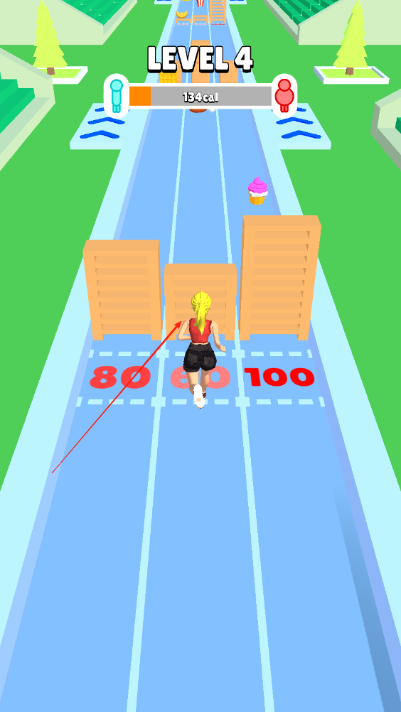 1、主题化赛道设计:赛道围绕减肥主题打造,融入健身房器械、健康食材等元素,与需躲避的高热量食物形成对比,贴合主题又增加场景趣味性,更有代入感。