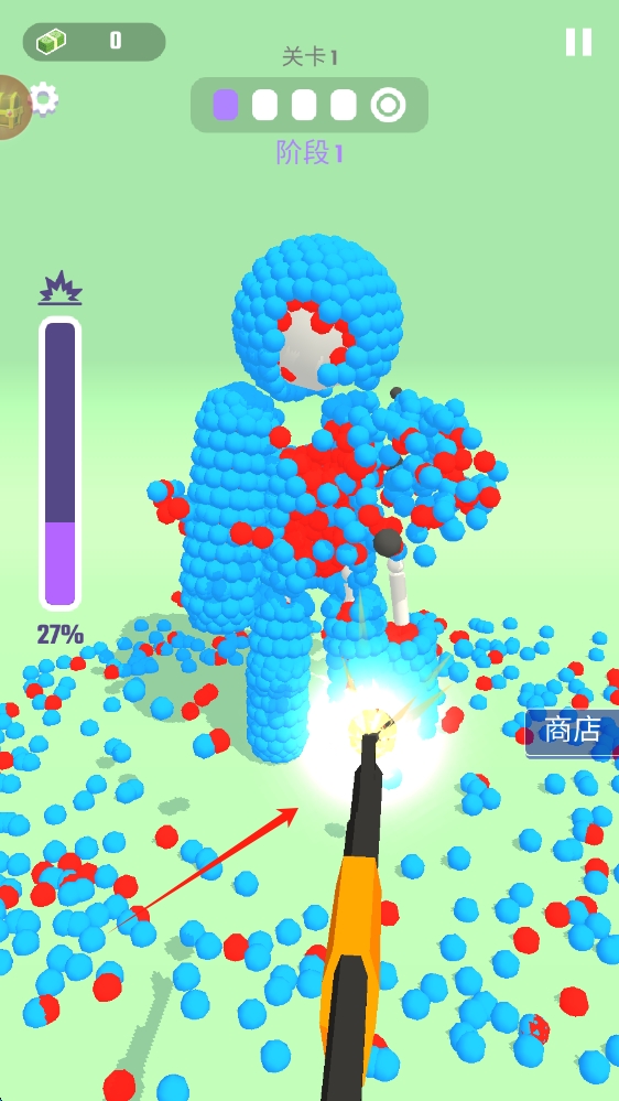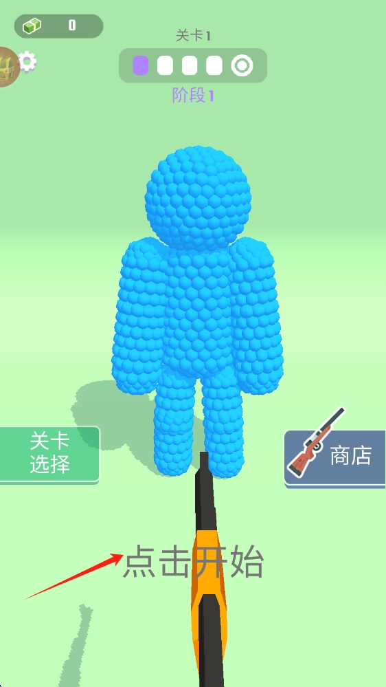 1、在关卡界面,点击屏幕,进入关卡1阶段1,操控武器射击蓝色人形物体,点击开始游戏。