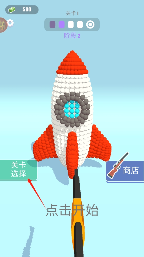 3、完成阶段1后,进入关卡1阶段2,点击点击开始,射击破坏火箭形状物体,积累金币,提升武器威力。
