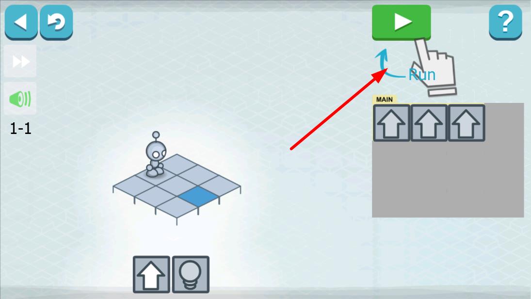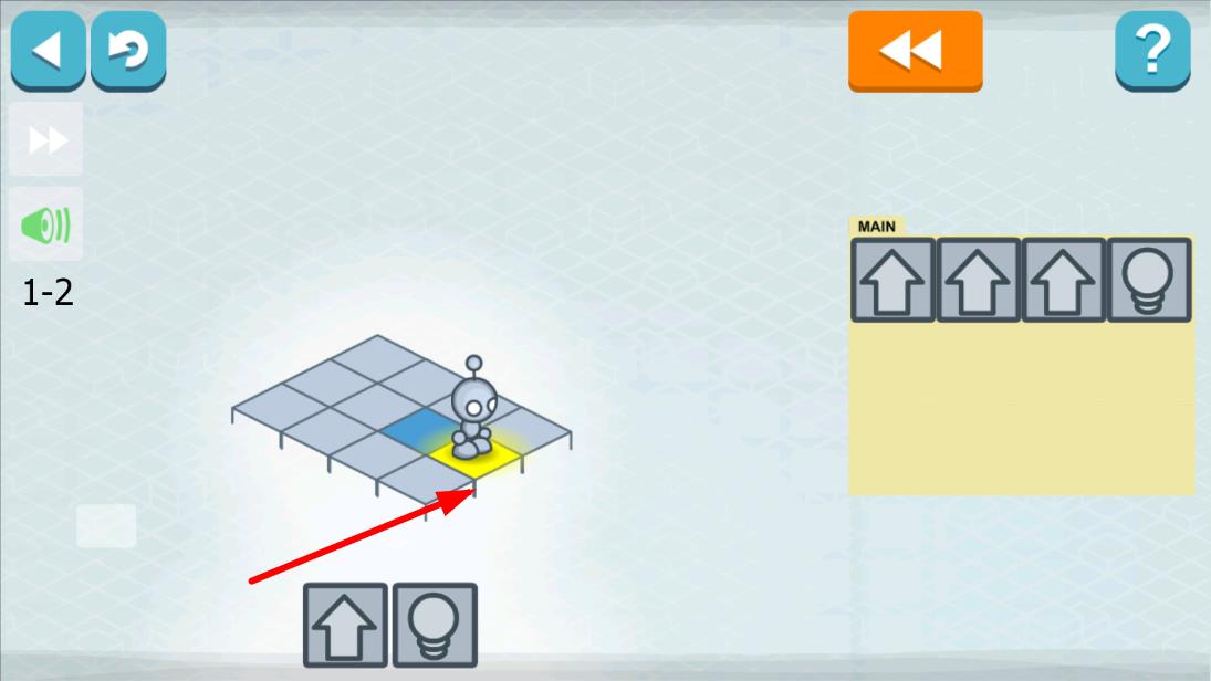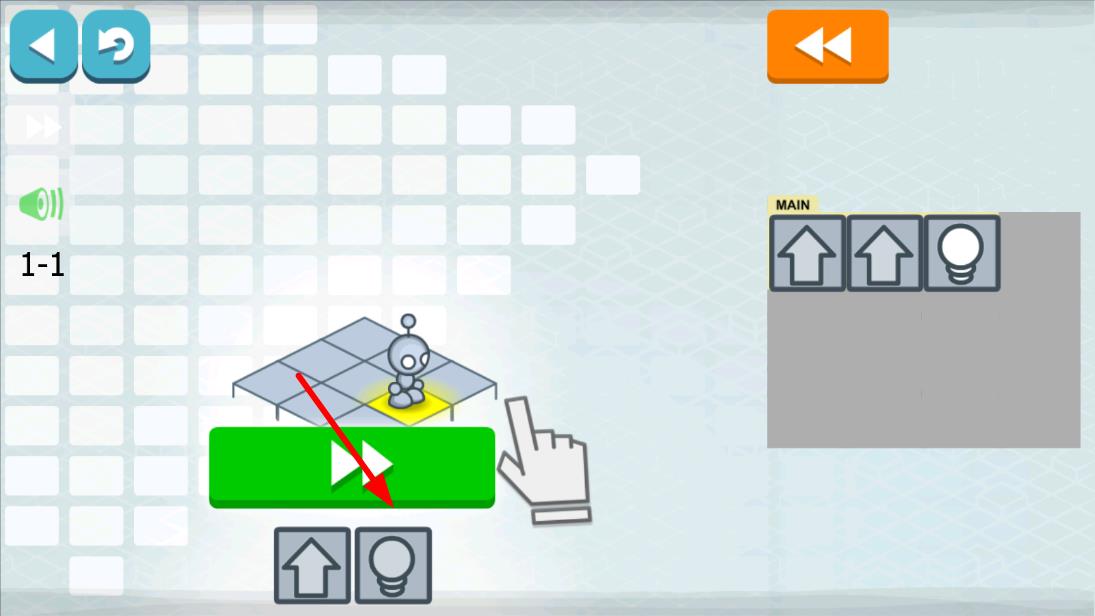 1、进入游戏后,查看关卡中灯泡和机器人的位置,根据提示了解直走、转弯等基础指令,尝试在MAIN方框放置指令让机器人移动。