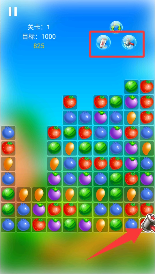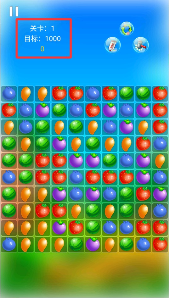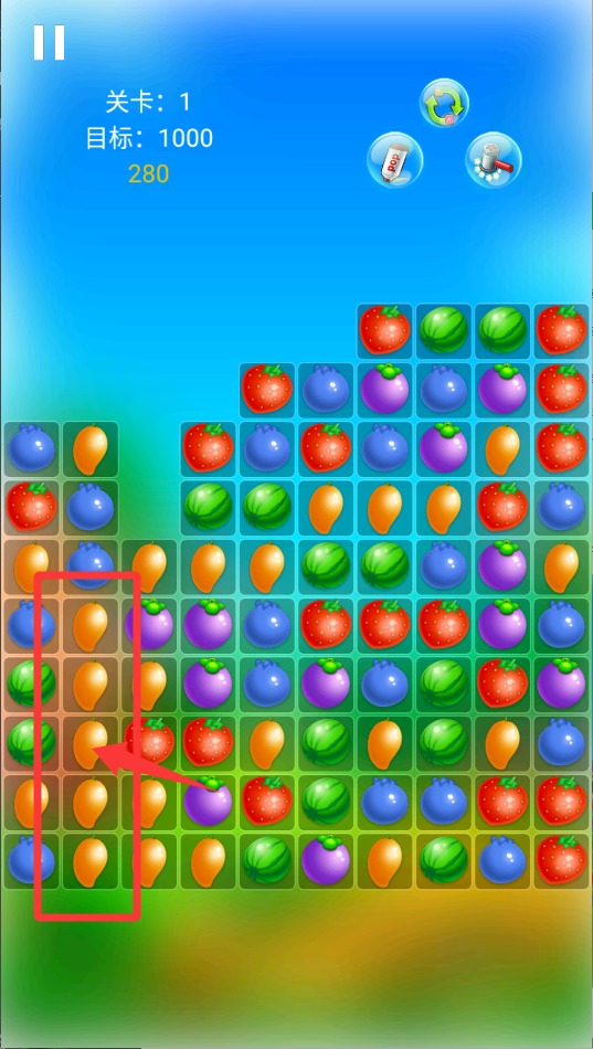 2、盯着屏幕找相同水果,三个以上连一起就能点,消除越多分数涨得越快,达到目标就能过关。