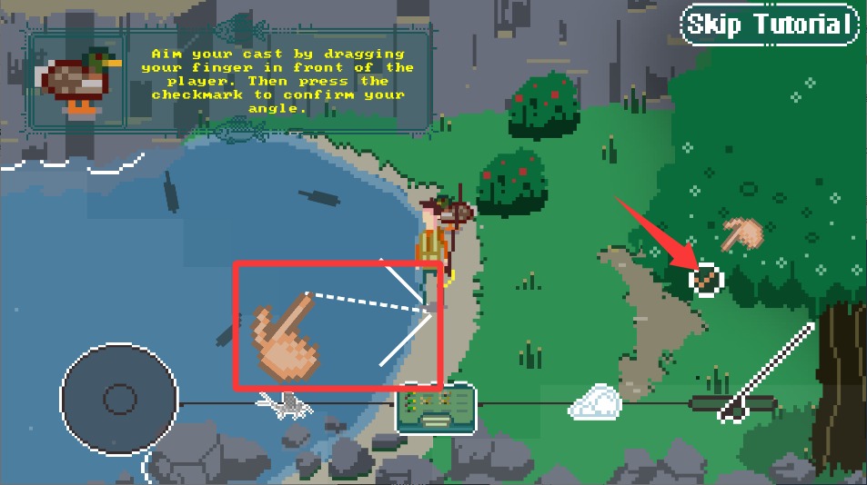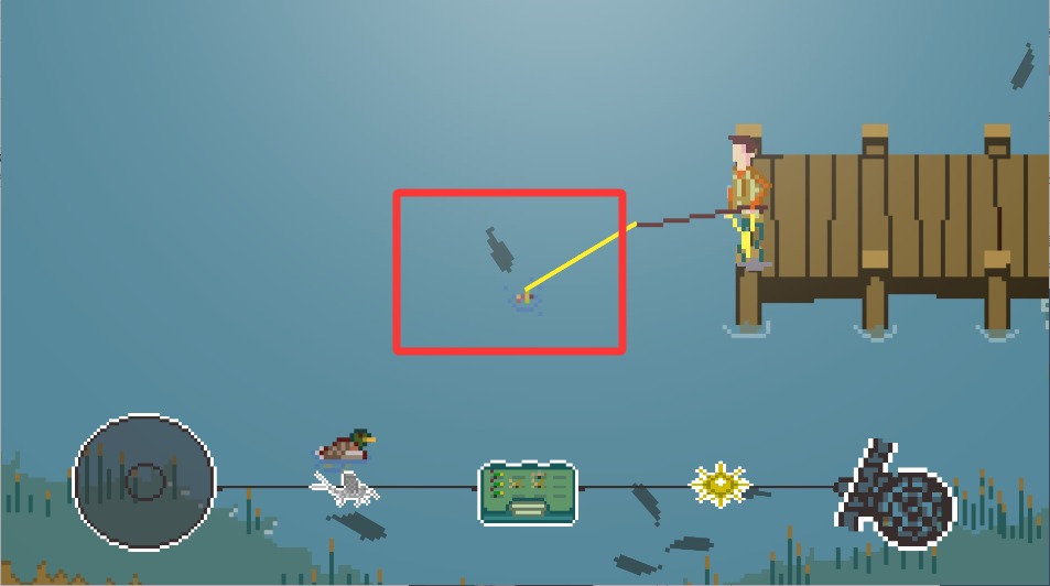 2、发现鱼群后点击鱼竿按钮准备抛竿,此时水面会显示鱼群游动轨迹,把握好最佳下钩时机。