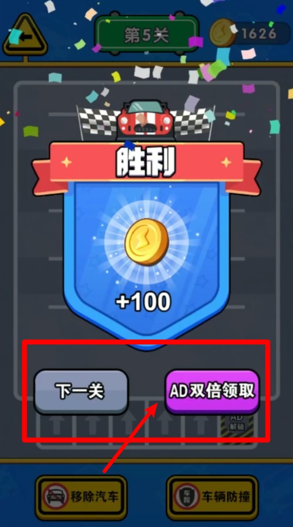3.关卡奖励:完成关卡后弹出奖励界面,玩家可以选择直接进入下一关或观看广告领取双倍奖励,增加游戏的趣味性和收益感。