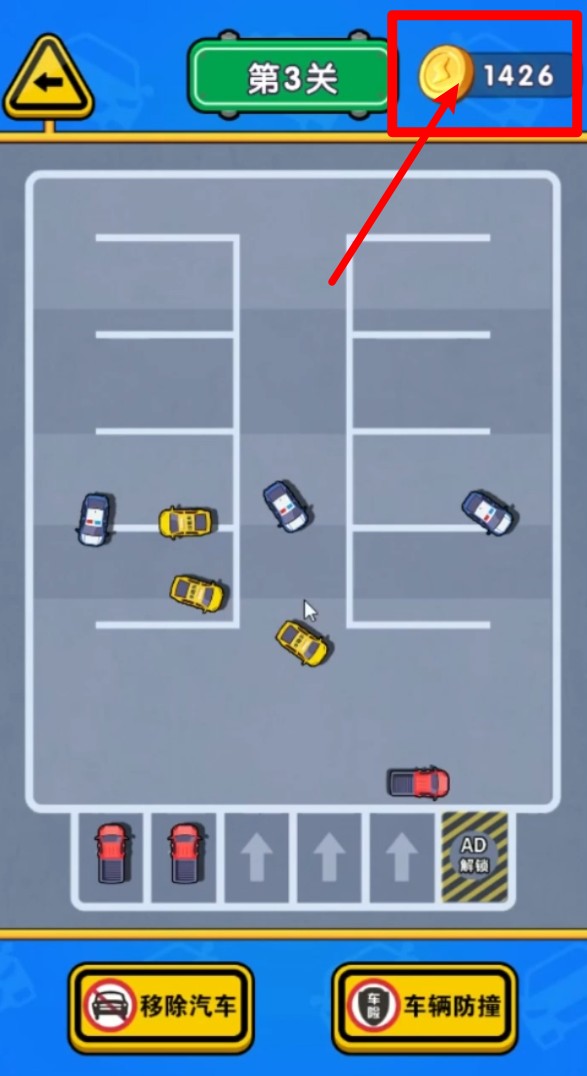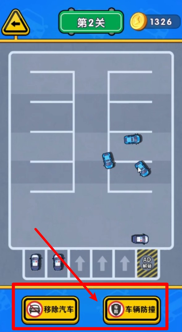 1.操作按钮:界面底部的“移除汽车”和“车辆防撞”按钮帮助玩家更好地控制停车场内车辆,避免碰撞并合理规划逃生路线。