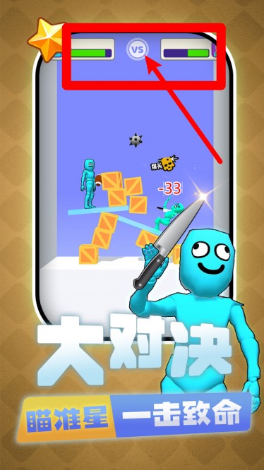 1.精准投掷攻击:操控蓝色角色,通过瞄准并投掷武器来攻击红色对手,利用精准的弧线轨迹击中目标以赢得对局。