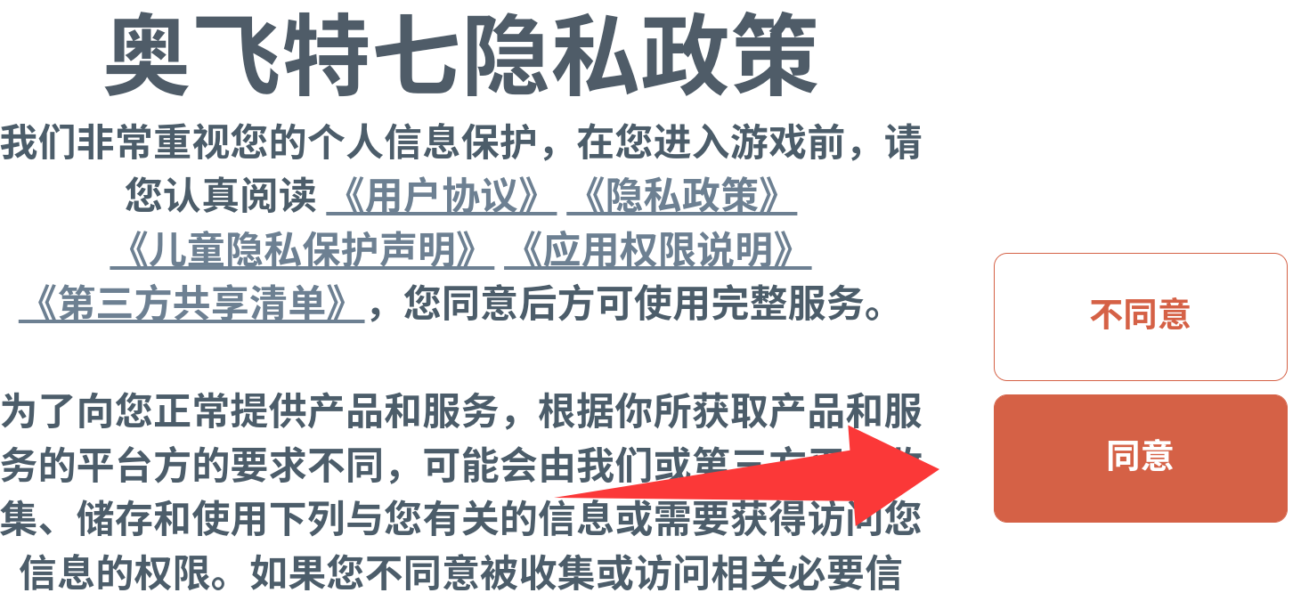 1、点击红色箭头同意并进入游戏。