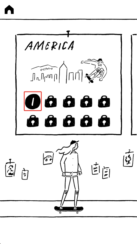 1、在关卡选择界面,点击标有1的圆形图标,进入AMERICA主题第一关,开启滑板挑战。