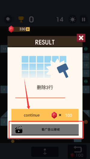 4、挑战失败时选择观看激励视频,即可获得继续游戏的机会重新尝试。