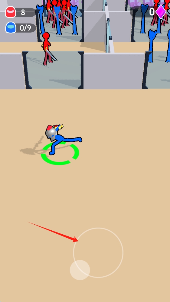 1、操控角色移动,利用虚拟摇杆灵活走位,避开敌人攻击,靠近目标区域推进游戏拨动轮盘移动人物。