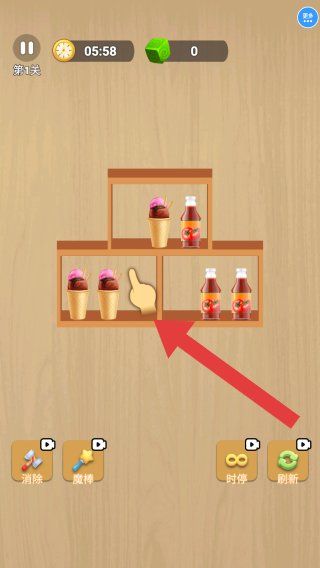 2、呈现第1关,有倒计时、道具消除、魔棒、时停、刷新等元素,玩法是将相同物品通过移动归位消除。