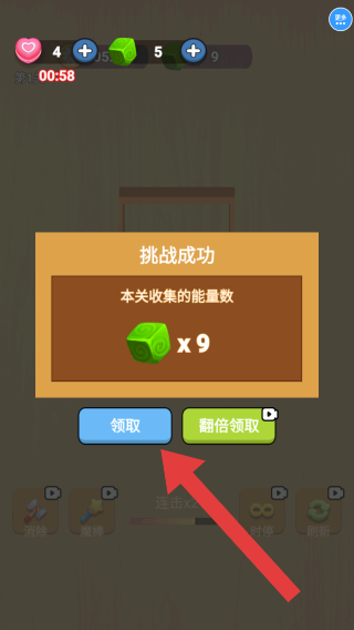3、显示挑战成功,本关收集能量数为9,有领取和翻倍领取按钮,呈现第1关剩余时间等信息,属于消除或收集类。