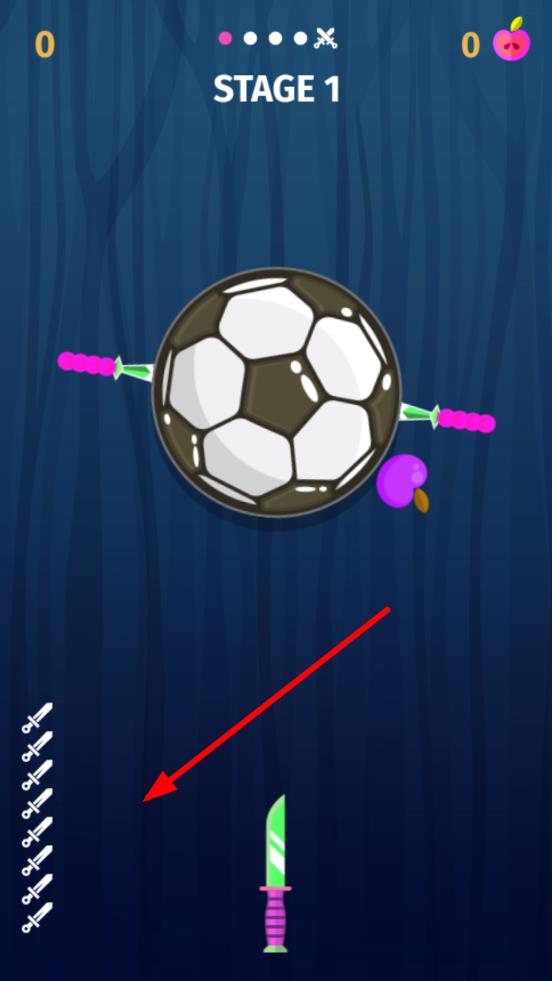 1、进入游戏点击“PLAY”按钮开启挑战,首关面对旋转的足球目标,仔细观察其转动节奏与规律,做好发射刀具的准备工作。