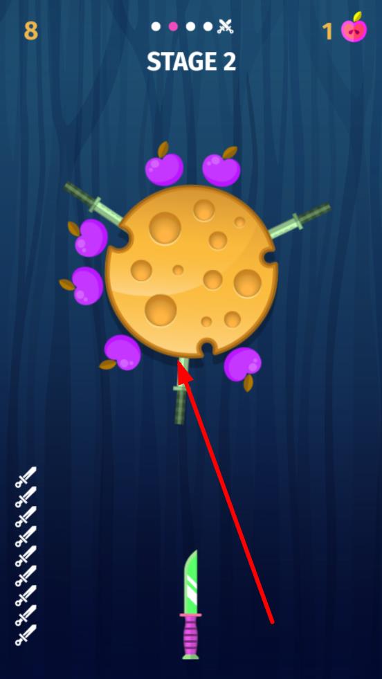 2、关卡推进至第二关,目标变为带有水果装饰的旋转奶酪,需瞅准间隙,适时点击屏幕发射刀具命中目标区域。