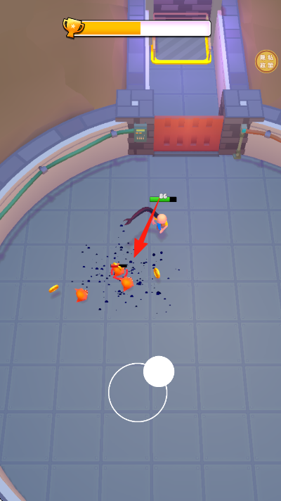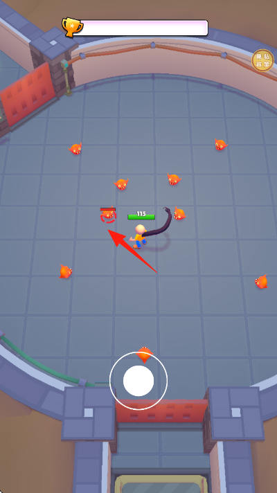 1、操控角色持镰刀小人,在圆形场地,靠近红色敌人鱼形怪,自动攻击收割,积累经验奖杯进度。