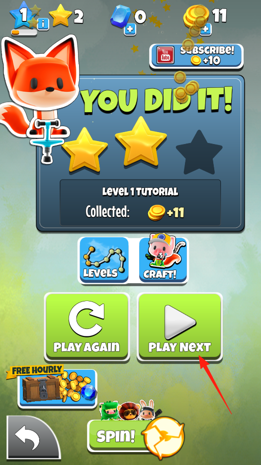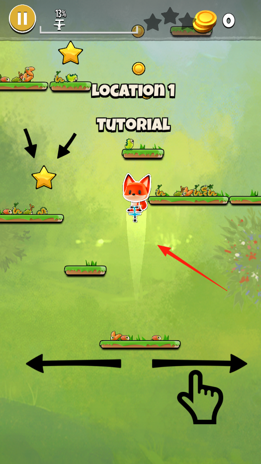 2、操控狐狸左右移动,在跑道跳跃,收集星星金币,避开障碍,完成教程挑战,体验平台跳跃玩法。