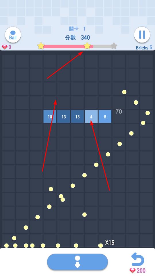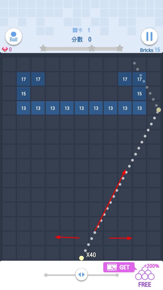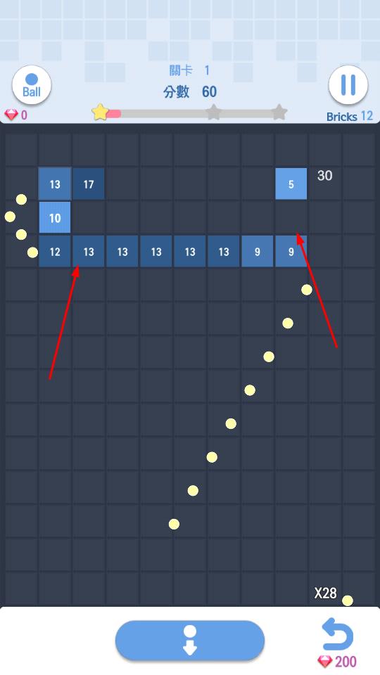 1、操控小球在带有数字的蓝色方块上弹跳,方块上的数字代表消除该方块所需的撞击次数。