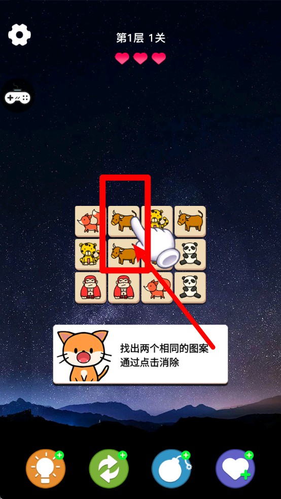 1.点击消除提示:找出两个相同图案的宠物方块并点击即可消除,完成任务后可解锁更高难度关卡。