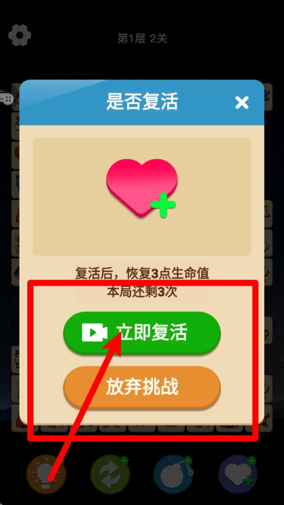 3.点击复活按钮:当挑战失败时,可选择点击绿色按钮观看视频立即复活,恢复三点生命值继续闯关。
