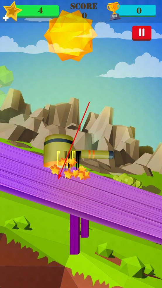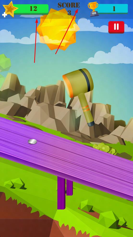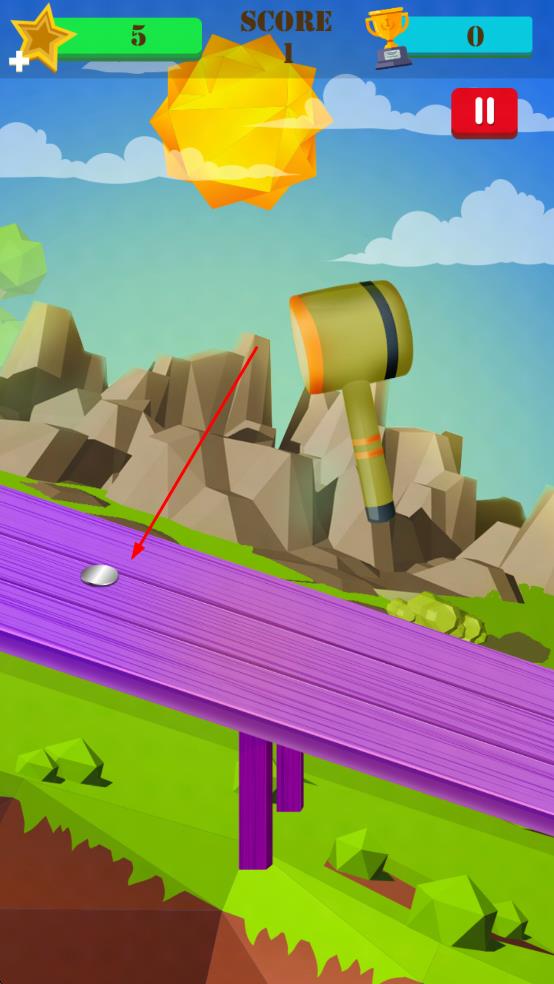 1、玩家将操控一个锤子在户外场景的紫色木板上移动,场景中有山脉、树木和太阳等元素。