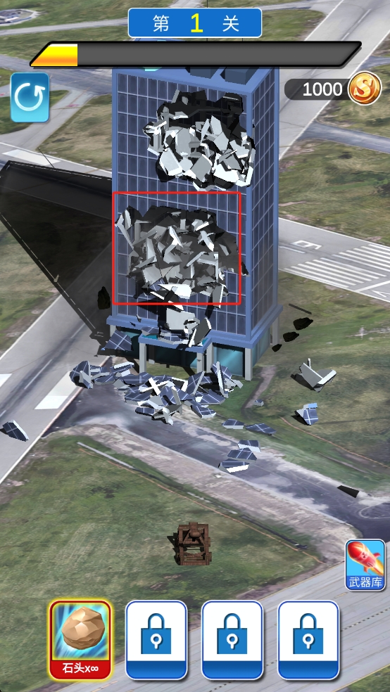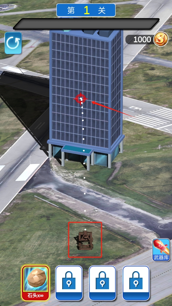 1、进入作品后我们点击左下角石头道具,瞄准高楼红色靶心位置,调整抛物线轨迹,让石头精准砸向建筑。
