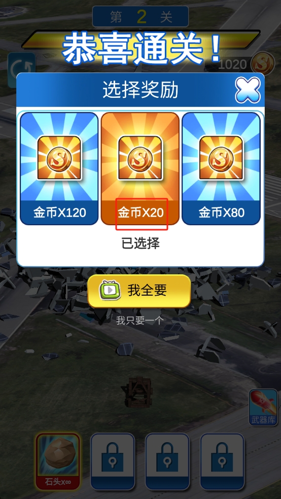 3、完成当前区域的破坏任务后,进入奖励选择界面,可直接选金币×20,或点击我全要按钮看广告获取全部奖励。