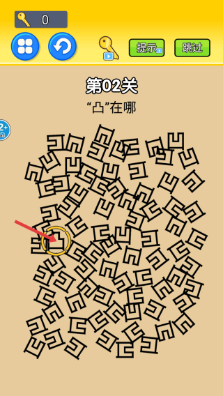 2、辨别凹字和凸字形状上的差别,有规律的寻找优先自己找练眼力,找不到时求助点击钥匙。