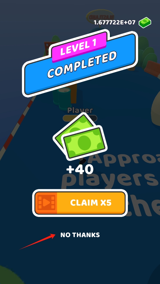 3、关卡完成后,根据需求选择是否观看广告,点击NO-THANKS,继续游戏进程,点击下一步。