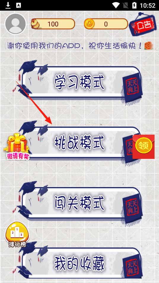1、点击挑战模式进入答题环节,选择该模式,开启知识挑战,体验不同答题规则机制。