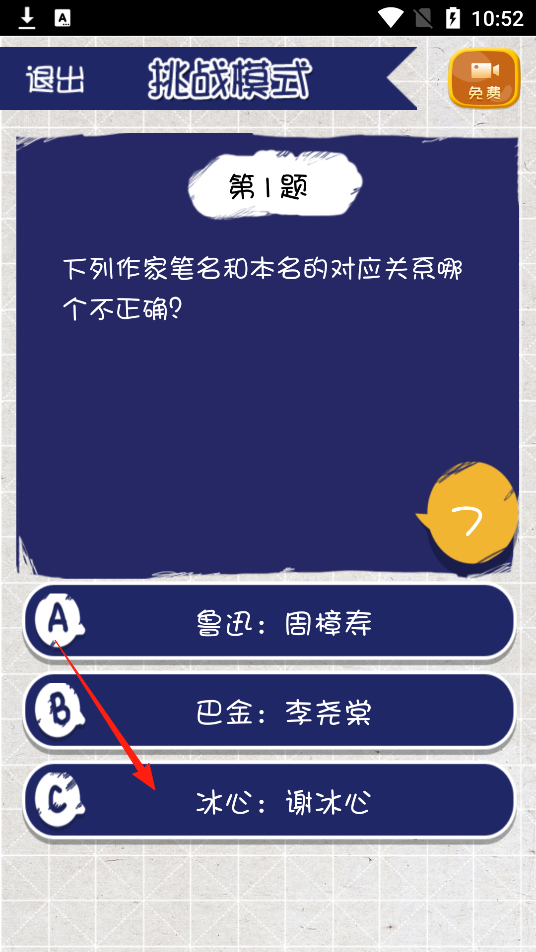 2、阅读题目,分析选项,判断作家笔名与本名对应关系,选择答案推进答题流程,体验文学知识考查玩法。
