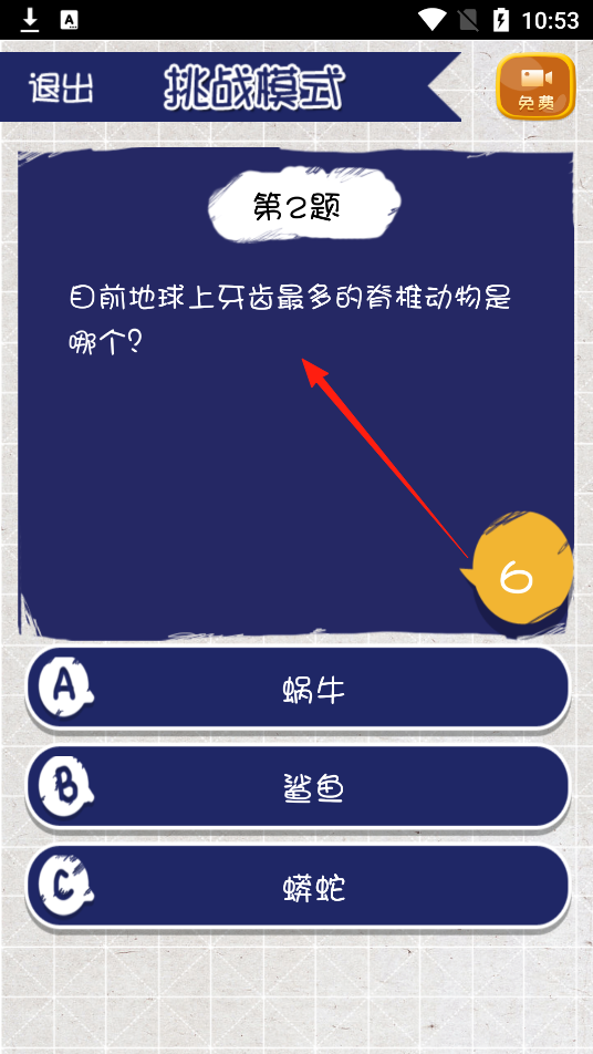 3、查看新题思考内容,针对脊椎动物牙齿问题,选择正确选项完成答题挑战,体验科普知识考查机制。