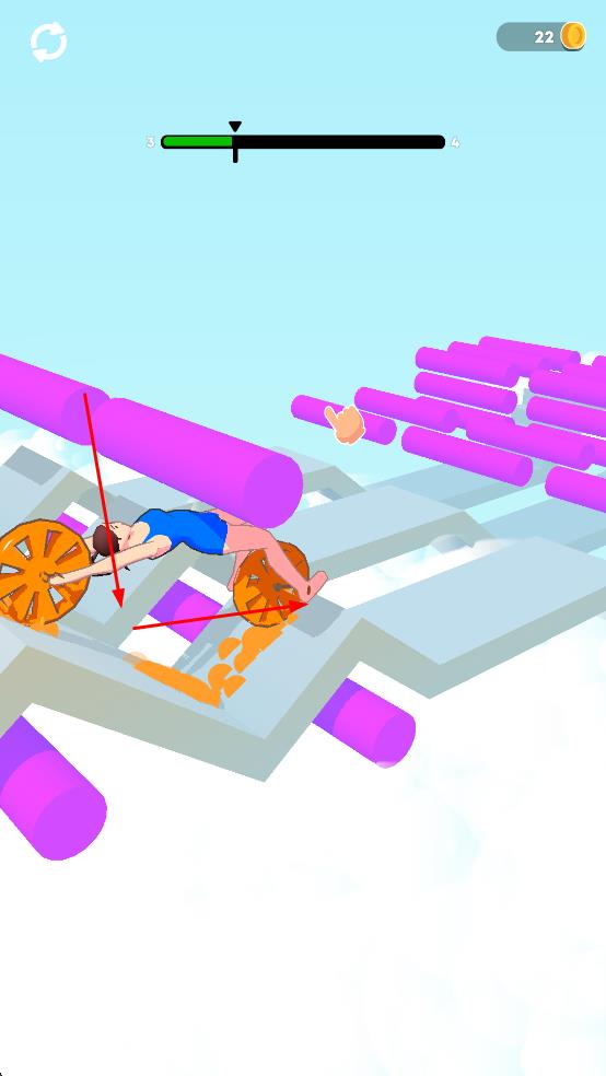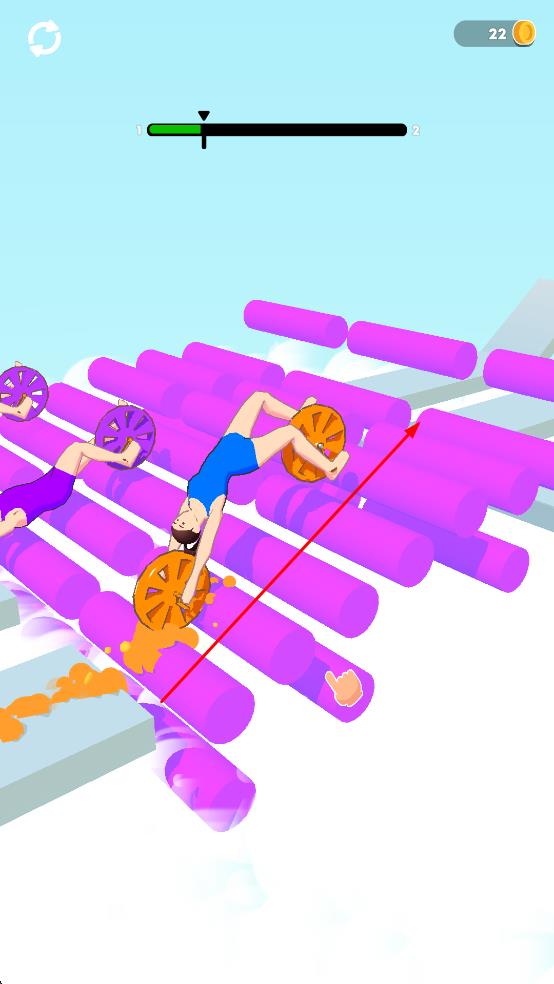 1、操控角色在由紫色圆柱等组成的赛道上前行,利用手中的橙色轮子保持平衡并前进。