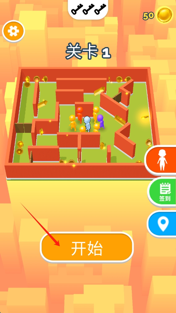1、点击开始,进入关卡1迷宫,开启收集金币的冒险,准备应对迷宫挑战,点击按钮开始游戏。