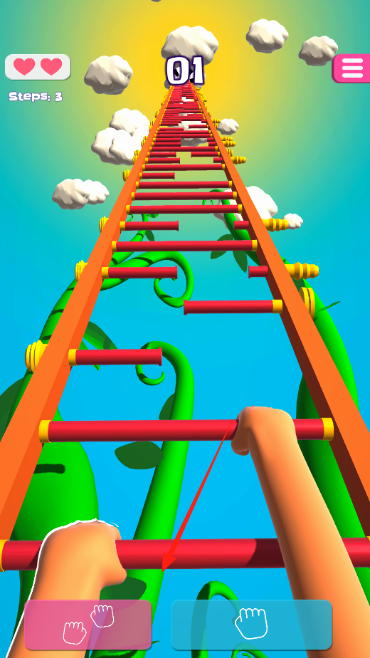 2、操控双手点击对应颜色按钮,交替攀爬跨越障碍,提升步数保持节奏,体验交替攀爬玩法。