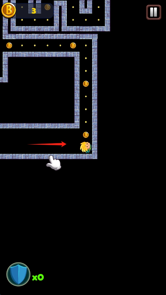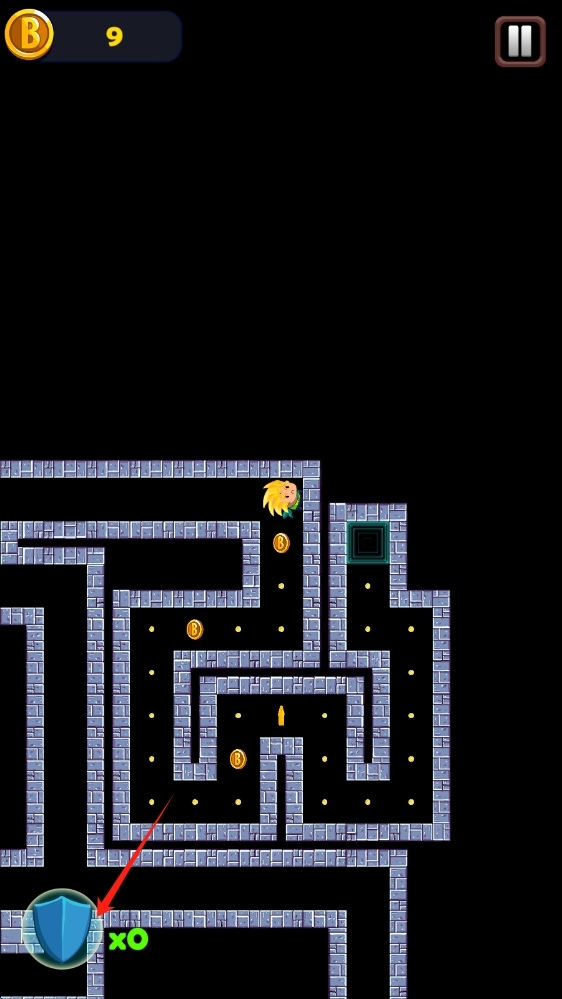 2、继续在迷宫中探索,尽可能收集所有金币,留意护盾道具,应对可能的危险,点击使用道具。