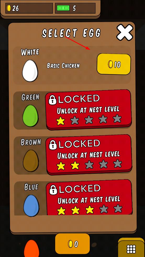 1、在选蛋界面选择可解锁的蛋如白色蛋,花费10金币解锁基础鸡,绿色、棕色、蓝色蛋需达到一定巢等级后解锁。