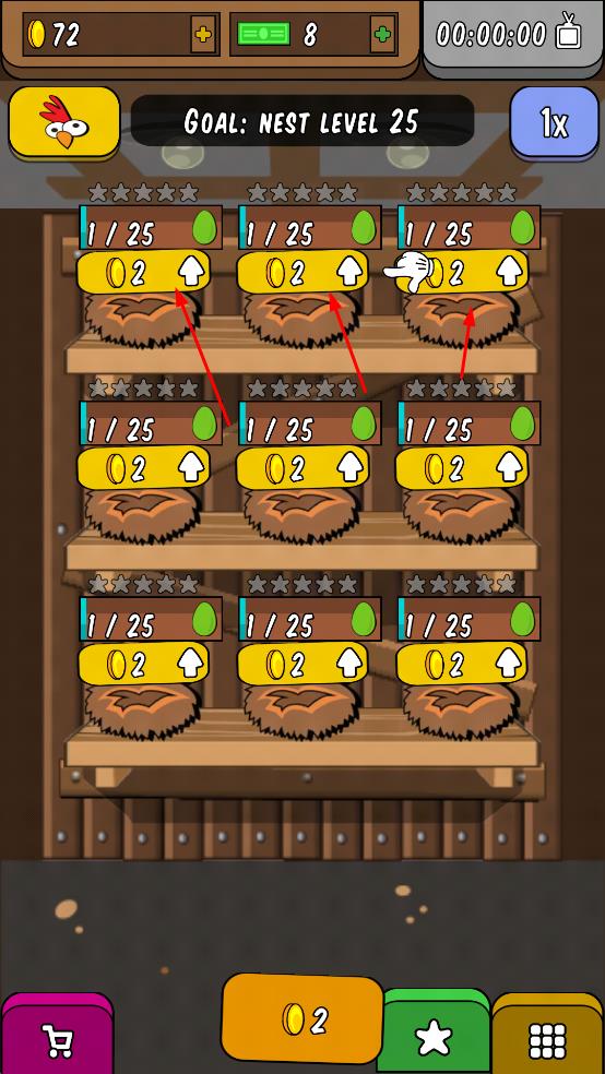 3、目标为将巢升级到25级,使用赚取的金币升级巢,每个巢升级需一定金币,升级后可提升产蛋能力和获取更多奖励。