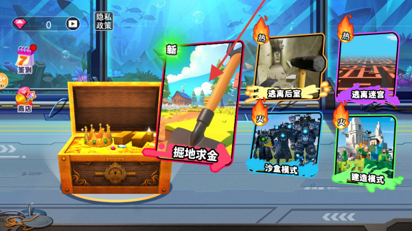 1、在游戏主界面,选择掘地求金模式,开启全新的游戏挑战,还可尝试逃离后室、逃离迷宫等热门模式。