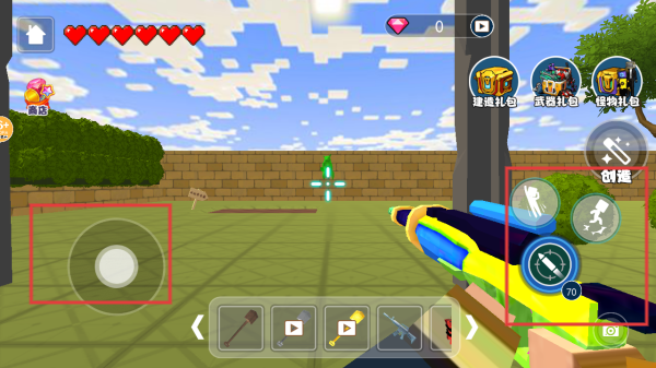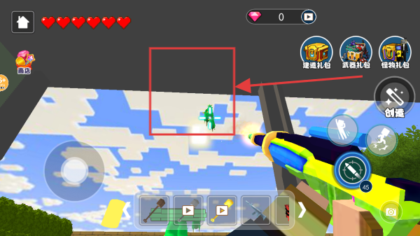 3、使用武器射击目标,如绿色物体,精准射击可完成任务,同时留意界面中的礼包功能,可获取建造、武器等相关道具。
