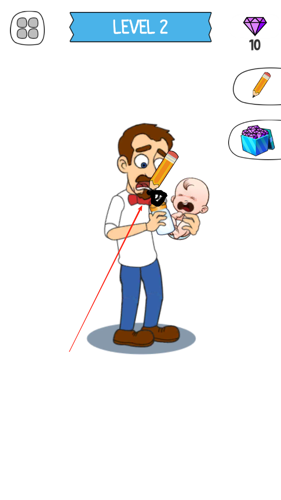 1、图中小婴儿止不住的哭闹,我们需要在男人手中的奶瓶上的奶嘴图画完整,将这样小婴儿才能正常喝奶,不再哭闹。