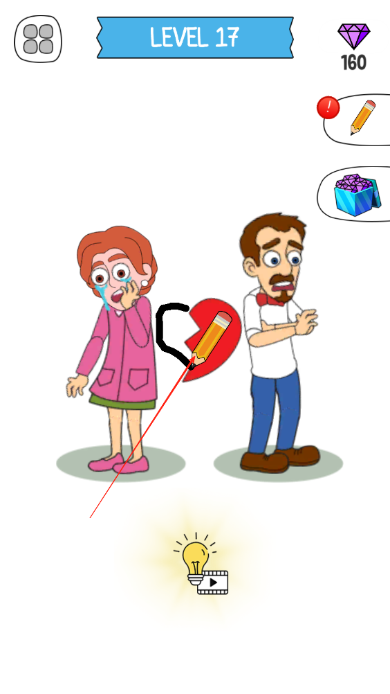 2、两人背身吵架流泪,将中间破裂残缺的心画补完整,即可让两人和好如初,即可进入下一关。