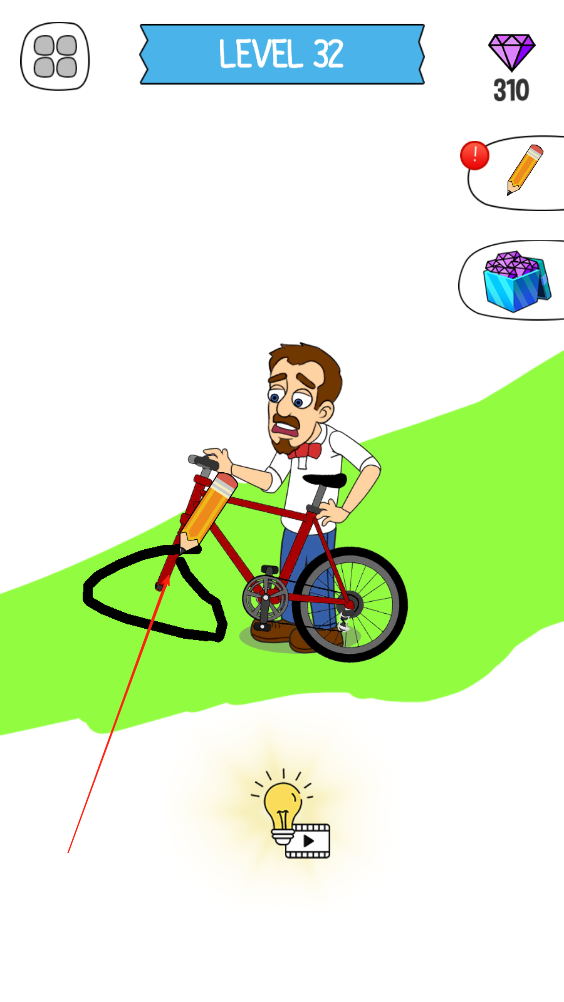 3、男人出行工具损坏无法正常出行,在缺失轮胎的自行车上画一个圆,补全这个轮胎,即可通关。