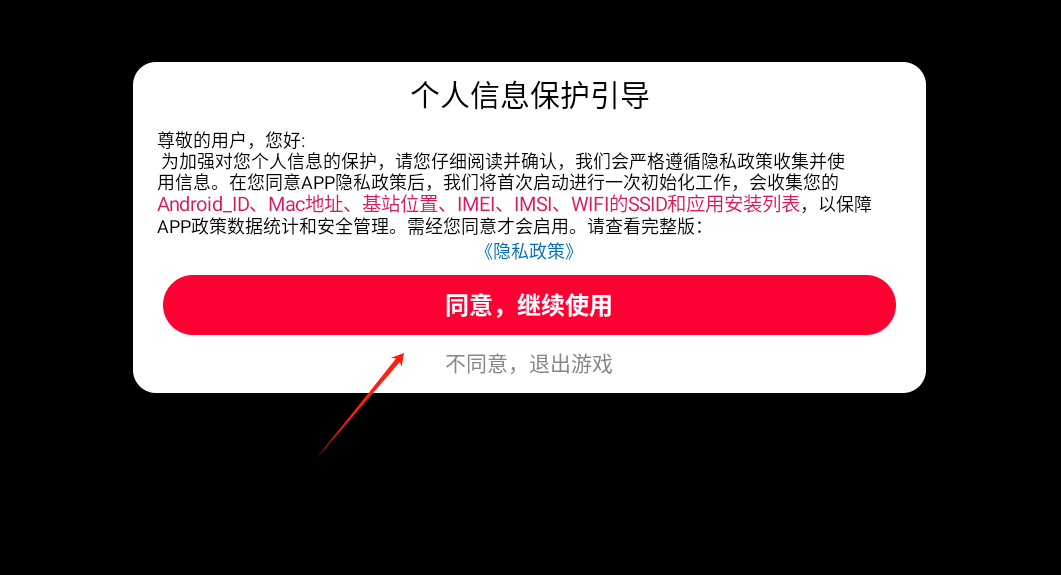 1、点击个人信息保护引导里的同意并继续。