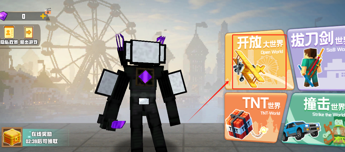 2、进入游戏界面点击红色框框的开发大世界。