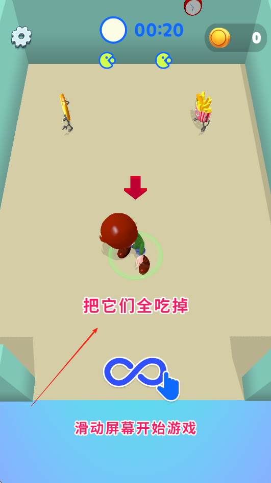 1、我们会化身一个吃货,场景内会出现各种会逃跑的食物,我们要操纵小人将场景内所有的食物统统吃掉。