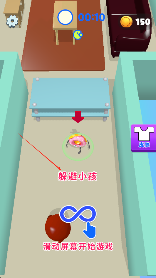 2、有些关卡我们还会化身食物,化身成食物的时候注意躲避想要吃掉我们的小人,我们可以钻进桌底或者沙发底下躲避抓捕。